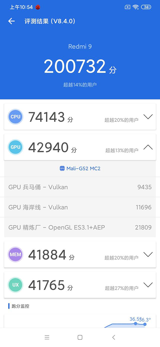 經(jīng)過實(shí)際測(cè)試,Redmi 9的安兔兔跑分為200732,其中CPU成績(jī)?yōu)?4143,GPU成績(jī)?yōu)?2940,雖然和目前最新制程的中端5G SoC略有差距,但放在4G里絕對(duì)能稱得上是中端芯片。