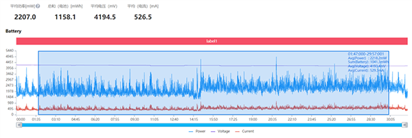 30分鐘掉電6%,平均整機(jī)功率為2207mW,可以估算Redmi 9的視頻續(xù)航時間在9小時左右。