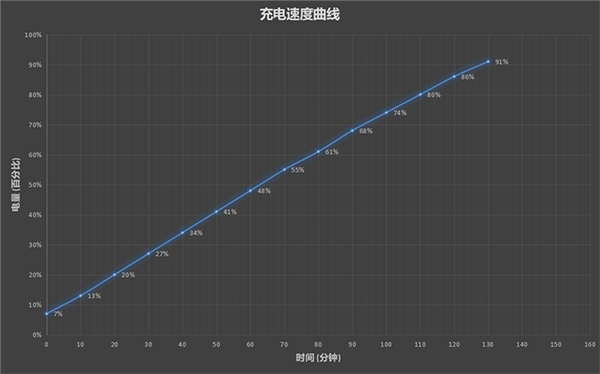 由于包裝中僅有10W充電器,所以只能對于Redmi 9在10W充電器下的充電速度進(jìn)行測試。幾乎大半程充電都近乎直線,花費(fèi)近2小時才可以將電量從7%充到90%,最后的10%會進(jìn)入涓流充電階段,需要的時間會更久。