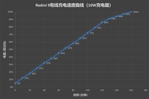 經(jīng)過測試,Redmi 9耗時160分鐘充滿5020mAh電池,如果對充電速度有要求的用戶,建議自行購買18W充電器。