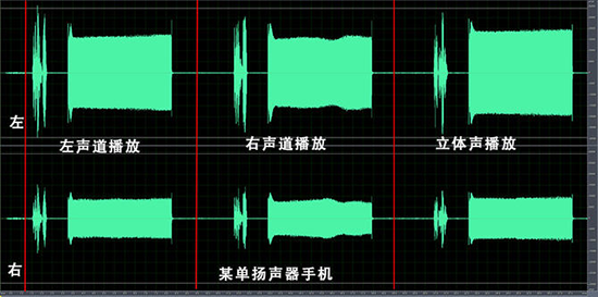 首先看一下左右聲道的測試,從測試的錄音可以清晰聽出榮耀X10 Max的左右聲道分離是相當(dāng)好,而對比的單揚(yáng)聲器手機(jī)聲音集中在了左聲道,因為手機(jī)只有一個揚(yáng)聲器。在看看記錄的聲音波形,可以看到榮耀X10 Max左右聲道分離完全,而單揚(yáng)聲器的手機(jī)聲音也集中在左聲道。