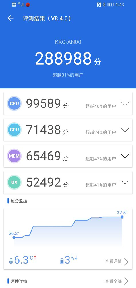 雖說跑分不能完全代表一款手機的好壞,但還是有參考價值的。從跑分來看,榮耀X10 Max安兔兔跑分為288988分,在這個價位段表現(xiàn)出色。具體各個方面來看,CPU跑分99589分,GPU跑分71438分,UX跑分52492分,MEM跑分65469分,各個子項的分數(shù)表現(xiàn)可圈可點,總體而言,榮耀X10 Max在跑分方面值得認可。