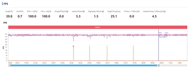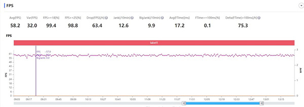 接下來是《王者榮耀》,在最高畫質下進行大約15分鐘的游戲,榮耀Play4 Pro的平均幀率為58.2fps,這個平均幀率是受到了兩個戰(zhàn)局之間設置過程的影響,實際在游戲對戰(zhàn)過程中,從下面的圖可以看到,是可以持續(xù)保證60fps的畫面輸出的,體驗也是絲滑流暢的。
