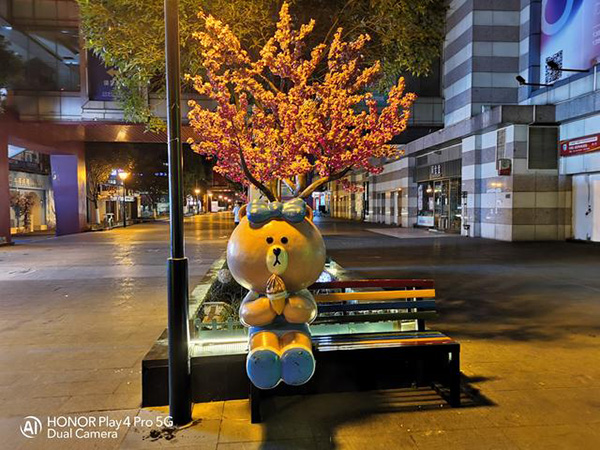 而在開(kāi)啟超級(jí)夜景模式之后,首先先看在光源不是很復(fù)雜的條件下榮耀Play4 Pro將地面倒映光源也是表現(xiàn)了出來(lái),而在拍攝的主體小熊上也是擁有了輪廓上的細(xì)節(jié),這種表現(xiàn)對(duì)于我來(lái)講確實(shí)還是能夠接受,畢竟暗部上也展現(xiàn)出了想要的細(xì)節(jié),在視覺(jué)上還是比較討喜的。