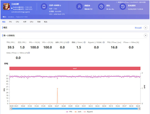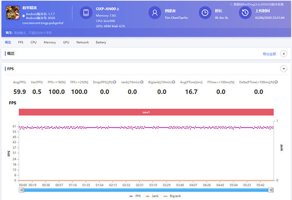 在游戲測試中,可以看到《王者榮耀》開啟高幀率模式和多核心支持后,游戲長時間保持在60幀,幀數(shù)跳動只有1幀,榮耀Play4 Pro對于《王者榮耀》這款游戲能提供足夠的性能支持,能在高幀率模式下流暢運行。另外,我們也使用《和平精英》進行測試,可以看到開啟高幀率模式下《和平精英》同樣長時間保持60幀,幀數(shù)跳動0.5幀,麒麟990的性能已經能很好支持各種大型游戲。