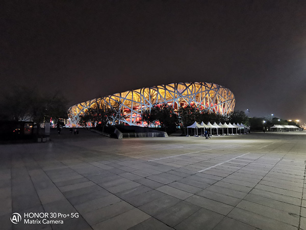 榮耀30 Pro+ 廣角拍攝的國(guó)家體育場(chǎng)(鳥巢)一角。