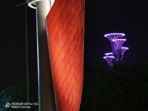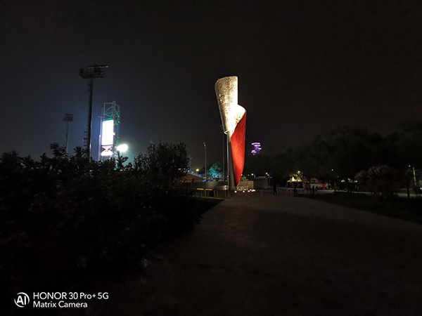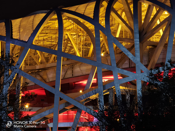 從拍攝圖片看,即使是咱夜間拍攝,榮耀30 Pro+對(duì)高光和暗處細(xì)節(jié)得到了很好的保留,色彩方面同樣養(yǎng)眼,比肉眼看到更為生動(dòng)的風(fēng)格,兼顧了自然和觀感。同時(shí),5倍光學(xué)變焦下鳥巢的內(nèi)部建筑架構(gòu)對(duì)比清晰可見。