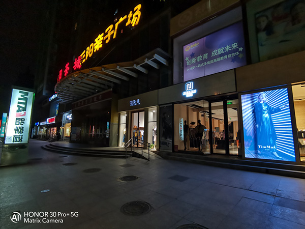 榮耀擁有業(yè)界領(lǐng)先的夜景算法,加上榮耀30 Pro+的1/2.8英寸超大底傳感器,讓榮耀30 Pro+的夜景拍攝同樣出色。同時(shí)榮耀30 Pro+夜景模式下可以使用廣角拍攝和長(zhǎng)焦拍攝。榮耀30 Pro+的夜景能有效控制噪點(diǎn),并且對(duì)光暗的控制非常到位,讓夜景的畫面非常通透。