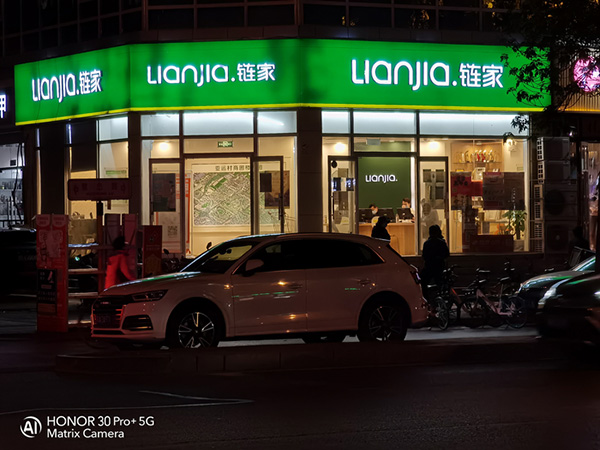 上述10倍變焦的圖像讓人眼前一亮的彩蛋是,街對(duì)面的鏈家門店標(biāo)識(shí)映射成像竟然清晰可見,而肉眼在同等距離下都沒(méi)這么清晰可辨。
