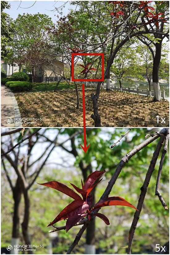值得一提的是,榮耀30系列在取景上做了優(yōu)化,引入了雙通道取景技術(shù)。在進行15倍以上的長焦拍攝時,取景界面會切換到雙通道模式,出現(xiàn)長焦畫中畫,可以幫助我們實時了解長焦鏡頭的取景與目標(biāo)拍攝物體的差距。這樣其實就可以很好地解決我們經(jīng)常面臨的必須先找到物體再變焦的方法,現(xiàn)在也可以先變焦再找準(zhǔn)拍攝物體。