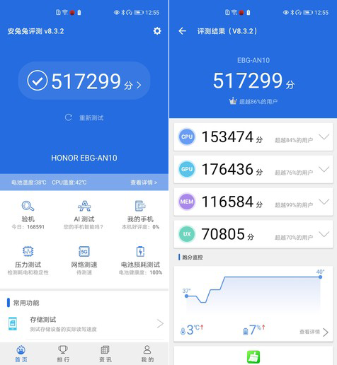在安兔兔跑分中,榮耀30 Pro+取得了517299分的成績,其中CPU得分153474分,GPU得分176436分,MEM得分116584分,UX得分70805分,這個成績也屬于麒麟990 5G的正常表現(xiàn),處于旗艦水準。