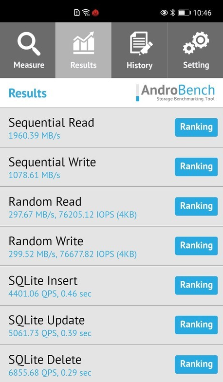 為了測試榮耀30 Pro+的存儲能力,我們用AndroBench來做一次測試,從測試結果來看,順序讀取速度可達1960.39MB/s,順序寫入速度可達1078.61MB/s,屬于旗艦機型數(shù)一數(shù)二的水準。