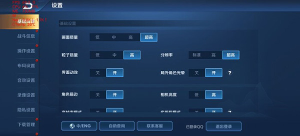 第一個(gè)體驗(yàn)的游戲是目前極具代表性的王者榮耀,設(shè)置選項(xiàng)中畫面質(zhì)量、粒子質(zhì)量、分辨率開到最高選項(xiàng),其它設(shè)置選擇全部打開。