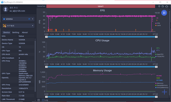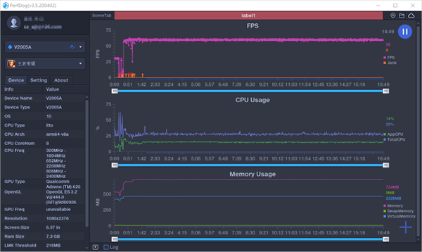 即使在特效全開的情況下,團(tuán)戰(zhàn)的時(shí)候,游戲也非常流暢,F(xiàn)PS的上下波動也可以小到忽略不計(jì)。下面這個(gè)是整個(gè)游戲過程中vivo X50 Pro的總體表現(xiàn),平均幀數(shù)高達(dá)59.9FPS,CPU平均占用不到15%,內(nèi)存占用更是低至735MB。