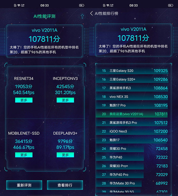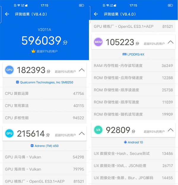 可以看到,我們手頭的這臺X50 Pro+配備了驍龍865和12+256GB的存儲配置。不論是在綜合測試的安兔兔,還是在比拼CPU性能的Geekbench,亦或是反映3D性能的3DAMARK,甚至是在專門考量手機AI計算速度的AIMARK中,驍龍865目前依然還是智能手機行業(yè)無可爭議、而且非常全面的“一把手”。將其用在X50 Pro+上,毫無疑問是絕對夠格的。