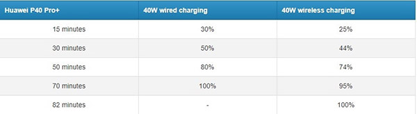 為了便于對(duì)比,下面是P40 Pro+ 40W有線和40W無線充電速度的對(duì)比表格: