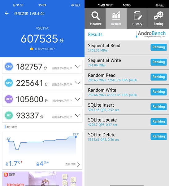 vivo X50 Pro+的性能表現(xiàn)無疑是頂級中的頂級,這里我們就直接通過基準(zhǔn)測試了解一下。安兔兔評測跑分成績輕松超過60萬分。在存儲方面的測速上,連續(xù)讀取速度高達(dá)1700Mb/s,連續(xù)寫入速度超過740MB/s,隨機(jī)讀寫速度均超過200MB/s,這些也是最頂級的存儲才有的高速表現(xiàn)。
