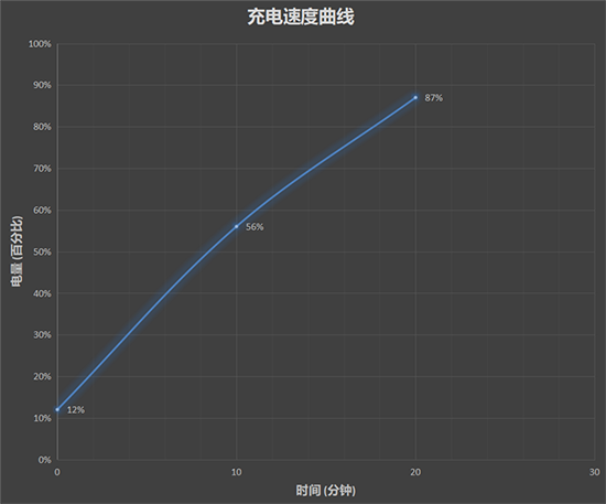 10分鐘讓電池從12%回血到56%,20分鐘回血到87%,這樣來看,充滿5000mAh電池至多也就是半個小時(shí)。