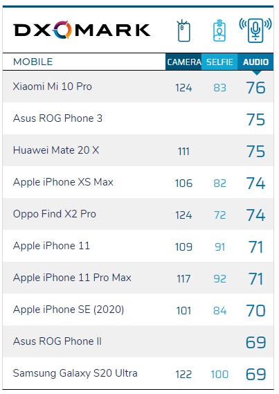 以下為 DxoMark 的音頻評分排行: