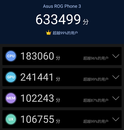 經(jīng)過(guò)性能測(cè)試軟件測(cè)試,本次測(cè)試的ROG游戲手機(jī)3為12GB+128GB版本,最終得分為633499分,在各個(gè)方面的得分都是非常不錯(cuò)的。