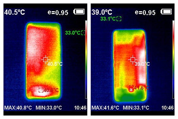 30分鐘的游戲之后,ROG游戲手機(jī)3的機(jī)身正面溫度為40℃,背部最高溫度為39℃,背部的溫度主要集中在散熱鰭片的區(qū)域,散熱鰭片對(duì)于手機(jī)的散熱作用還是非常明顯的。
