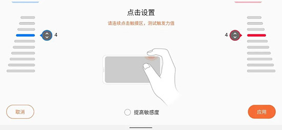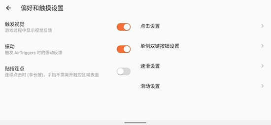 進入AirTriggers的個人偏好和觸摸設置里面,玩家還可以對AirTriggers肩鍵的四個手勢設定敏感度、觸發(fā)面積、觸發(fā)速度、觸發(fā)距離等,可調整的項目比較多,比較人性化。