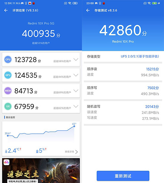 我們就實(shí)際為Redmi 10X Pro進(jìn)行跑分。我們使用安兔兔進(jìn)行綜合跑分和存儲(chǔ)測(cè)試。綜合跑分方面,Redmi 10X Pro得分400935分,UX單項(xiàng)得分67959分。存儲(chǔ)測(cè)試方面,Redmi 10X Pro測(cè)出的順序讀寫速度分別為994.5MB/s和490.3MB/s,隨機(jī)讀寫速度分別為241.8MB/s和273.1MB/s。