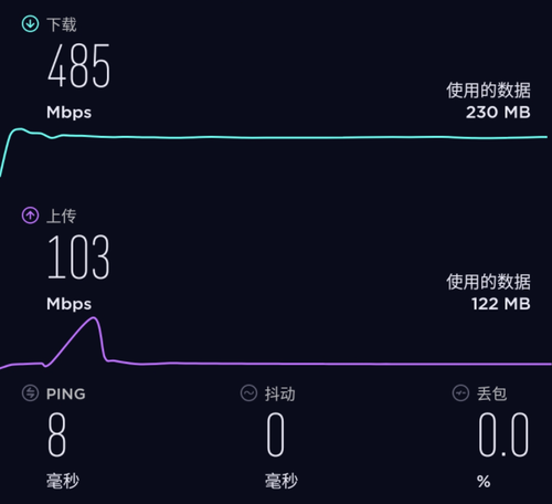 通過Speedtest進(jìn)行5G速度測試,最終下載速率為485Mbps,上傳速率為103Mbps,這個速度也已經(jīng)達(dá)到了目前5G主流旗艦的水平。