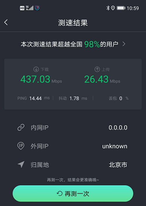 而5G網(wǎng)絡(luò)具有高速率、低延時(shí)等優(yōu)勢(shì),在實(shí)際測(cè)試中我們也可以看到,5G的下行速度為437.0Mbps,上行速度為26.43Mbps,和500M的寬帶速率相近,延時(shí)也是非常低,僅為14ms。