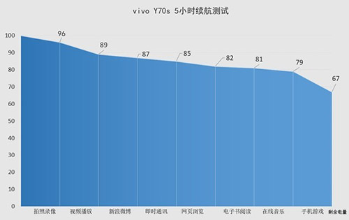 在Wifi環(huán)境下,我們對vivo Y70s進(jìn)行包含了拍照、視頻播放、網(wǎng)頁瀏覽、游戲等場景在內(nèi)的5小時續(xù)航測試。
