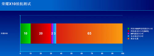 我們也針對榮耀X10進(jìn)行4小時(shí)的高強(qiáng)度續(xù)航測試,手機(jī)插入一張SIM卡并開啟5G,藍(lán)牙、wifi、NFC打開狀態(tài),手機(jī)屏幕亮度100%,完成一項(xiàng)測試清理一次后臺(tái)應(yīng)用。首先進(jìn)行1個(gè)小時(shí)網(wǎng)絡(luò)1080P視頻播放,一個(gè)小時(shí)后消耗10%的電量,之后進(jìn)行1個(gè)小時(shí)的游戲,在高幀率模式下消耗了20%電量,在進(jìn)行1小時(shí)MP3播放,消耗了2%的電量,進(jìn)行1小時(shí)5G通話測試,消耗了3%的電量,4小時(shí)總共消耗了35%的電量,剩余65%的電量。整體來說榮耀X10的續(xù)航表現(xiàn)讓人滿意,畢竟90Hz的屏幕刷新率下耗電量會(huì)有所增加。