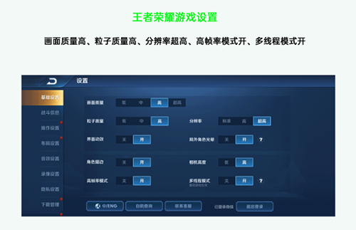 開(kāi)局來(lái)一把王者榮耀,將游戲設(shè)置成畫面質(zhì)量高、粒子質(zhì)量高、分辨率超高、打開(kāi)高幀率模式和多線程模式。