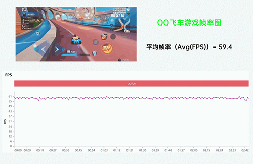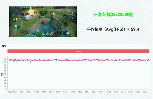 使用PerfDog測(cè)得游戲全程平均幀率為59.4幀,其中FPS>=50[%]占比100%,F(xiàn)PS>=60[%]占比30.8%。