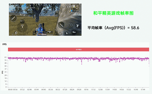 使用PerfDog測(cè)得游戲全程平均幀率為58.6幀,其中FPS>=50[%]占比99.7%,F(xiàn)PS>=60[%]占比17.0%。