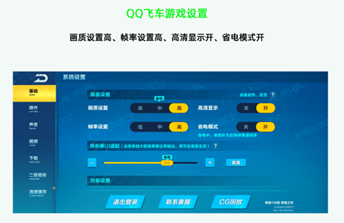 跑把飛車,將QQ飛車游戲畫質(zhì)設(shè)置高、幀率設(shè)置高、高清顯示和省電模式打開(kāi)。