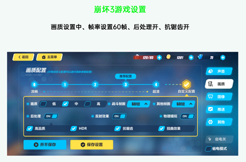 將二次元巨作《崩壞3》游戲設(shè)置成畫質(zhì)中、幀率60幀、后處理和抗鋸齒以及HDR打開(kāi),進(jìn)行一把游戲。