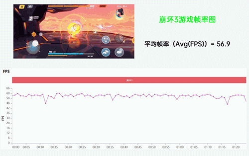 使用PerfDog測(cè)得游戲全程平均幀率為56.9幀,其中FPS>=50[%]占比96.5%,F(xiàn)PS>=60[%]占比2.4%。