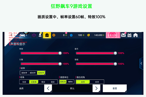 然后飆個(gè)車,《狂野飆車9:競(jìng)速傳奇》是款很真實(shí)的飆車游戲,游戲里面的特效和光影做的都很豐富,所以對(duì)手機(jī)的性能考驗(yàn)比較大,將游戲設(shè)置畫質(zhì)中(默認(rèn))、幀率60幀、特效100%打開(kāi)。