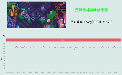 最后我們玩局最近比較火爆的一款游戲——《荒野亂斗》,游戲在默認(rèn)設(shè)置下,使用PerfDog測(cè)得游戲全程平均幀率為57.5幀,其中FPS>=50[%]占比100%,F(xiàn)PS>=60[%]占比0%。