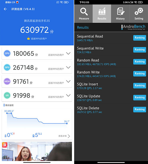 跑分方面,黑鯊3S安兔兔跑分高達(dá)63萬(wàn)+,這樣的分?jǐn)?shù)在目前旗艦機(jī)中都是很靠前的。使用的是AndroBench中存儲(chǔ)測(cè)試,騰訊黑鯊游戲手機(jī)3S順序讀取速度為1645.75MB/s,順序?qū)懭胨俣葹?24.52MB/s,隨機(jī)讀取速度為182.65MB/s,隨機(jī)寫(xiě)入速度為174.01MB/s,充分保障設(shè)備性能及運(yùn)行效率