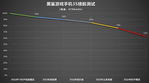 騰訊黑鯊游戲手機(jī)3S采用了4720mA大容量雙電池,獨(dú)有的串聯(lián)并充方案可以有效增加電池續(xù)航時(shí)長(zhǎng),等效增加電池容量約300mAh,有效保證玩家的游戲續(xù)航時(shí)長(zhǎng)。根據(jù)實(shí)驗(yàn)室測(cè)試數(shù)據(jù),騰訊黑鯊游戲手機(jī)3S的王者榮耀續(xù)航時(shí)長(zhǎng)高達(dá)7個(gè)小時(shí),比5000mAh的友商游戲手機(jī)的續(xù)航時(shí)長(zhǎng)超1.8個(gè)小時(shí)。