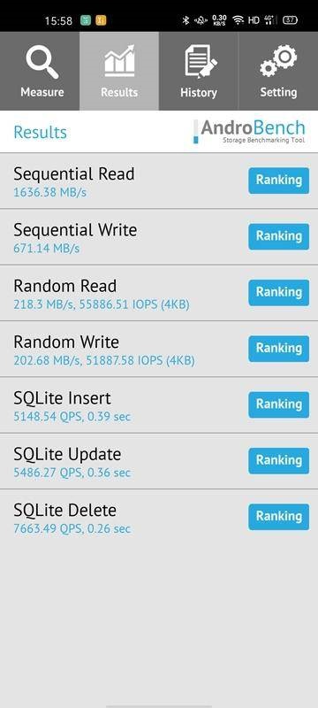 在我們的實(shí)際測(cè)試中,OPPO Ace2的順序讀取速度達(dá)到1636MB/s,順序?qū)懭胨俣冗_(dá)到671MB/s,隨機(jī)讀取速度達(dá)218MB/s,隨機(jī)寫(xiě)入速度達(dá)202MB/s。作為對(duì)比,UFS 3.1正常情況下,順序讀取達(dá)到1800MB/s,順序?qū)懭雱t達(dá)到700MB/s。而標(biāo)準(zhǔn)的UFS3.0則為1500MB/s以及500MB/s。