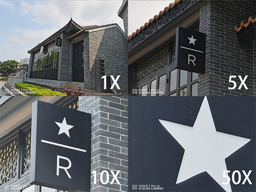 華為nova7 Pro可以實現(xiàn)從0.6X廣角到50X數(shù)碼變焦的拍攝,可以看到在5X和10X變焦的時候已經(jīng)保持較好的畫質(zhì),到50X數(shù)碼變焦的時候,雖然畫質(zhì)有所損失,但依然能清晰看到拍攝的內(nèi)容。