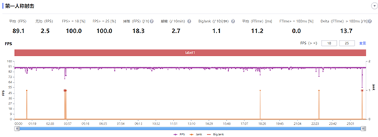 若是想要在《和平精英》中開啟90Hz幀率,目前必須將畫質(zhì)設(shè)置為流暢。在這個設(shè)置下,該機在26分鐘11秒的游戲時間內(nèi)基本可以全程穩(wěn)定在90FPS的幀數(shù)上下,而平均幀數(shù)則達到了89.1FPS,不過60.5℃的CPU平均溫度確實相對更高些。