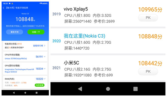 按照魯大師的評分體系,Nokia C3的整體性能大致與多年前的驍龍652機型以及唯一一款澎湃S1機型小米5C相近。
