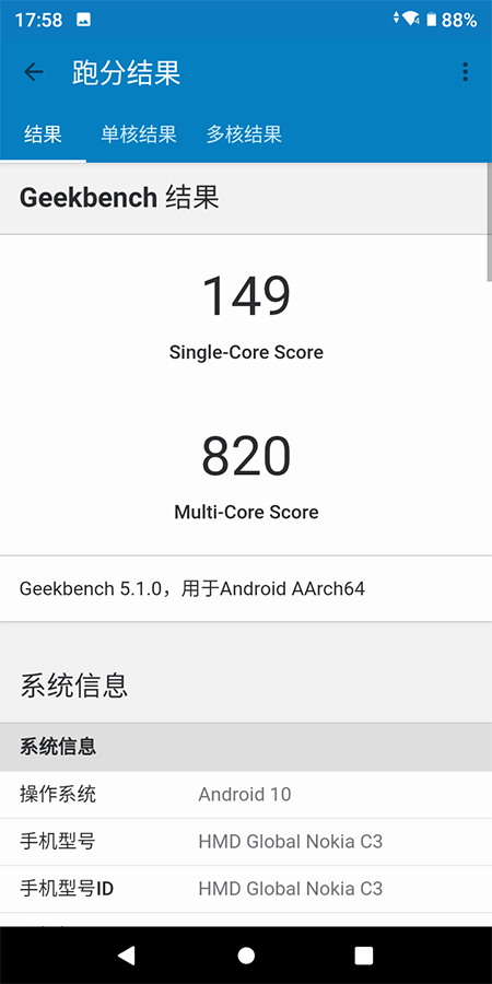 按照安兔兔的評價體系,Nokia C3的整體性能大致與驍龍450機型相近。這里安兔兔的評分結果和魯大師一樣,也顯示其整體性能與小米5C相近。