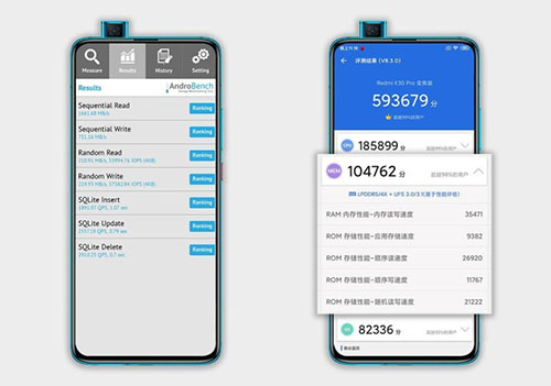 AndroBench是一款手機(jī)存儲(chǔ)性能的測(cè)試軟件,測(cè)試結(jié)果顯示,Redmi K30 Pro的連續(xù)讀取速度1661MB/s,連續(xù)寫入速度751MB/s,讀寫速度非??捎^。在安兔兔MEM存儲(chǔ)性能的測(cè)試中,得分超過(guò)10萬(wàn)。