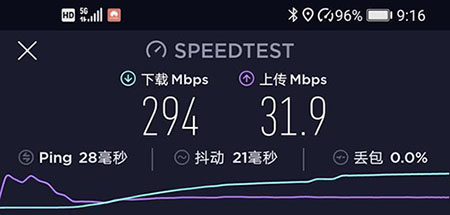 根據(jù)數(shù)據(jù)顯示,麥芒9下載速度為294Mbps,上傳速度為31.9Mbps,Ping值為28毫秒,抖動為21毫秒。在不開通5G套餐的前提下,麥芒9的5G網(wǎng)速無論上下載速度、穩(wěn)定性都十分優(yōu)秀。