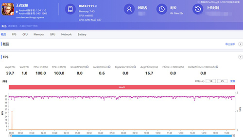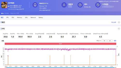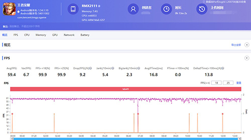 改回設(shè)置后,realme真我V5的游戲體驗好了很多,幀率曲線近似水平直線,幀率方差降到了1.0。