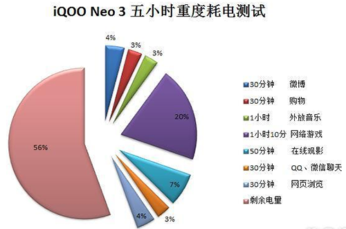 經(jīng)過5個小時的重度耗電測試下來,iQOO Neo3的電量從100%下降為56%,總體而言非常令人滿意,當(dāng)然這種測試強(qiáng)度屬于一個上班族的正常使用狀態(tài),5小時的連續(xù)重度使用后電量依然保持活力,看來是可以從此告別充電寶了。